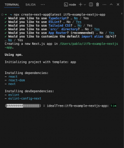 Ejecuta el comando npx para comenzar la instalación del proyecto. Puedes sustituir my-next-app por cualquier nombre, usa minúsculas y no uses espacios, solo guión-medio. Te pedirá definir una configuración, en nuestro caso te recomendamos para iniciar: